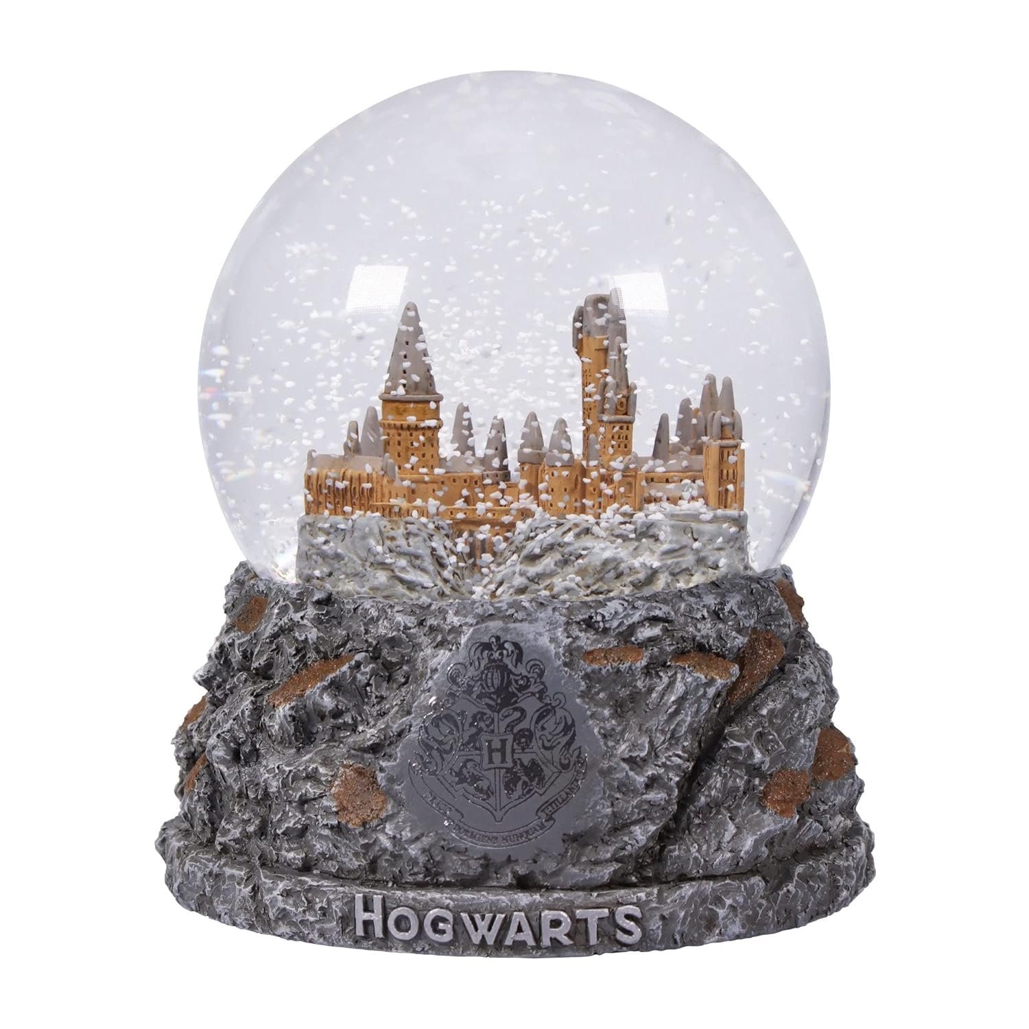 - The base of the globe ornament rests on a craggy rock face, featuring an ornate Hogwarts crest; Admire the intricate detailing of the Hogwarts snow globe, the ideal mini snow globes for children!