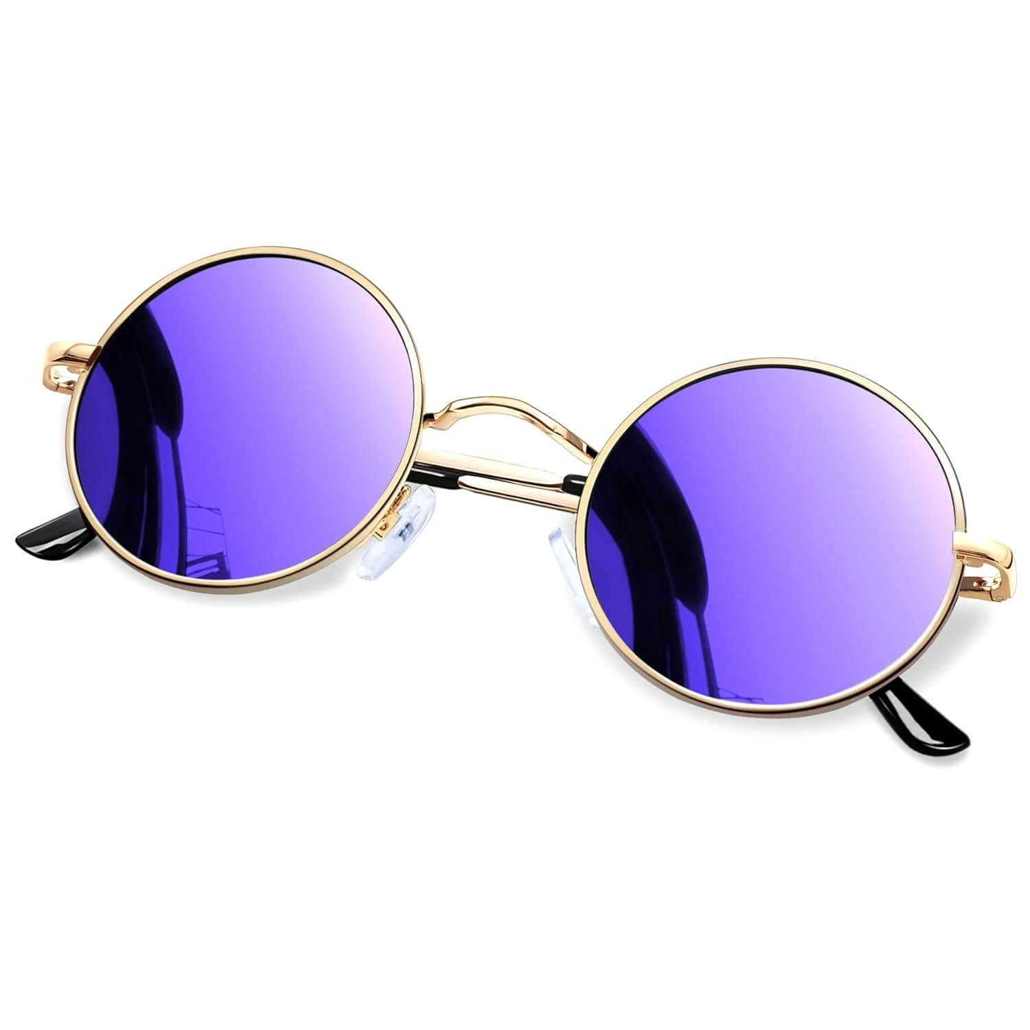 KANASTAL Purple Round Sunglasses Men Mirror Polarised Womens Small Hippie Vintage Circle Metal Circular Mirrored Flat Lens UV400 - Gold Frame Purple Lens