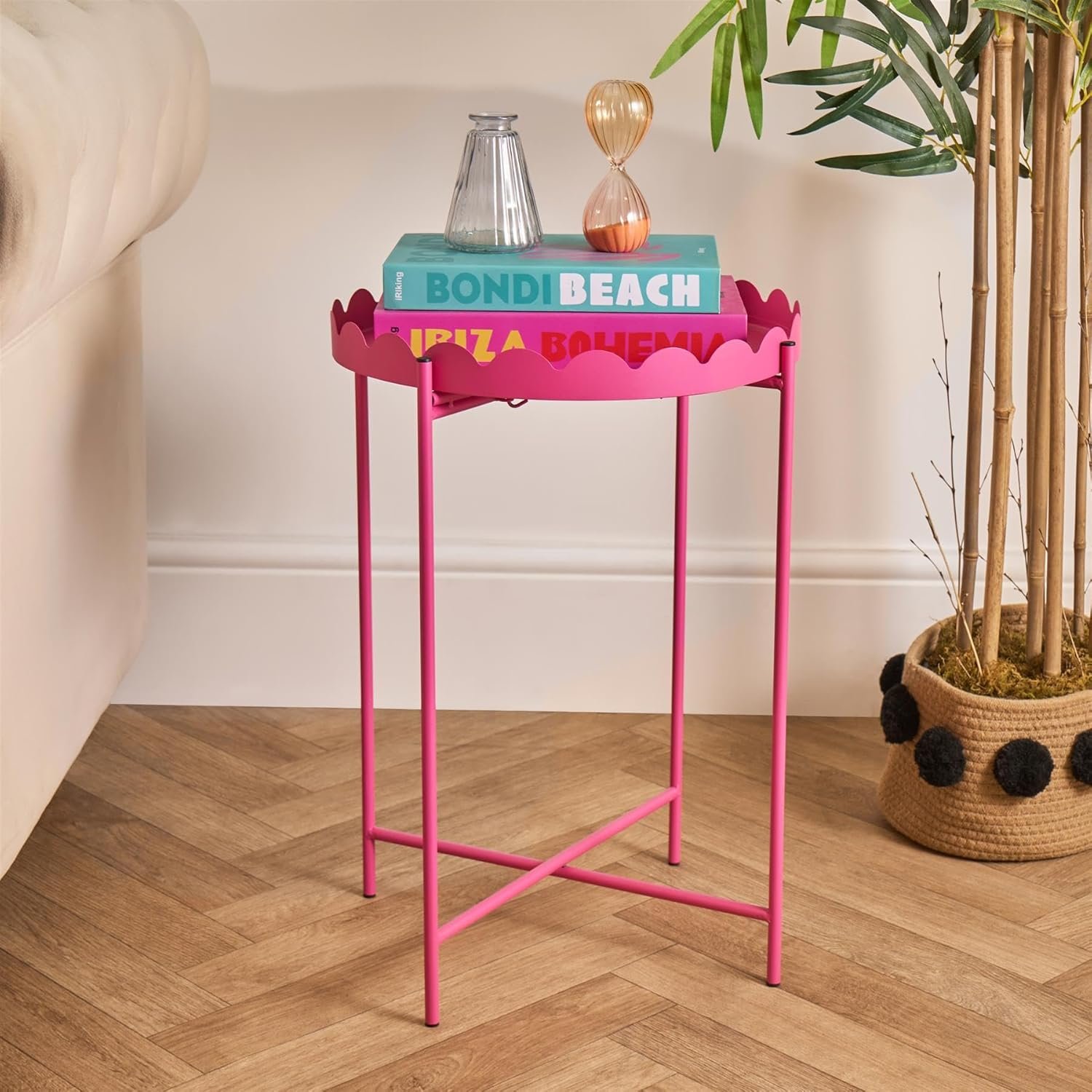 - Sofa End Table: Add a pop of personality to any room with this eye-catching side table. The sofa table feature a bright pink finish and scalloped edge bringing a stylish, playful touch to your living room, bedroom or office decor.