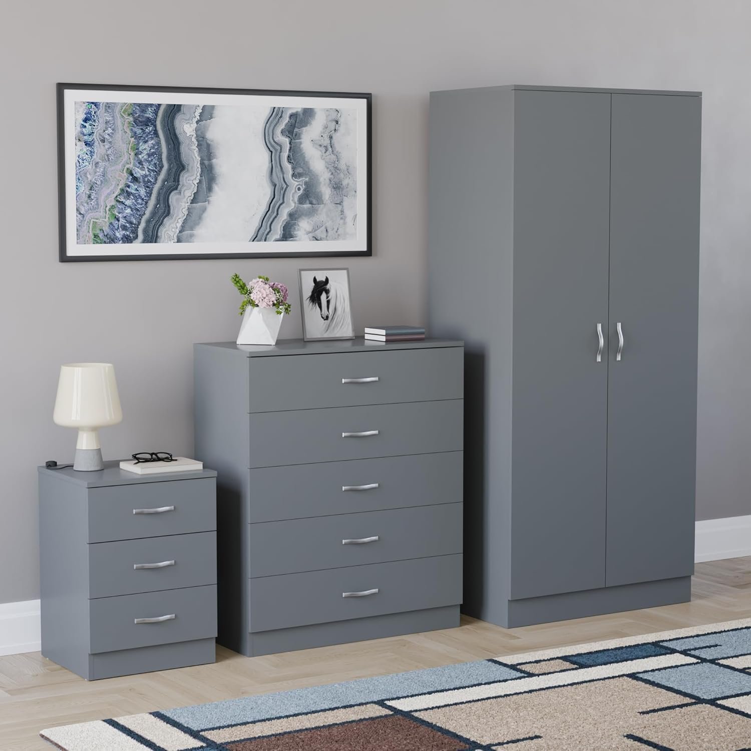 Vida Designs Riano 3 Piece Bedroom Set - 3 Drawer Bedside Chest, 5 Drawer Chest, 2 Door Wardrobe - Grey