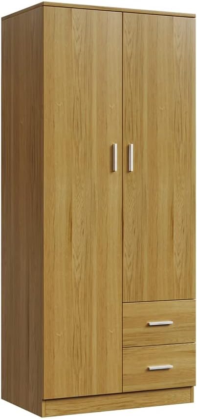 Wooden 2 Door 2 Drawer Wardrobe with Shelf and Hanging Rail Modern Clothes Storage Cupboards Unit for Bedroom Furniture W 77 * D 50 * H 180cm (Oak Effect)