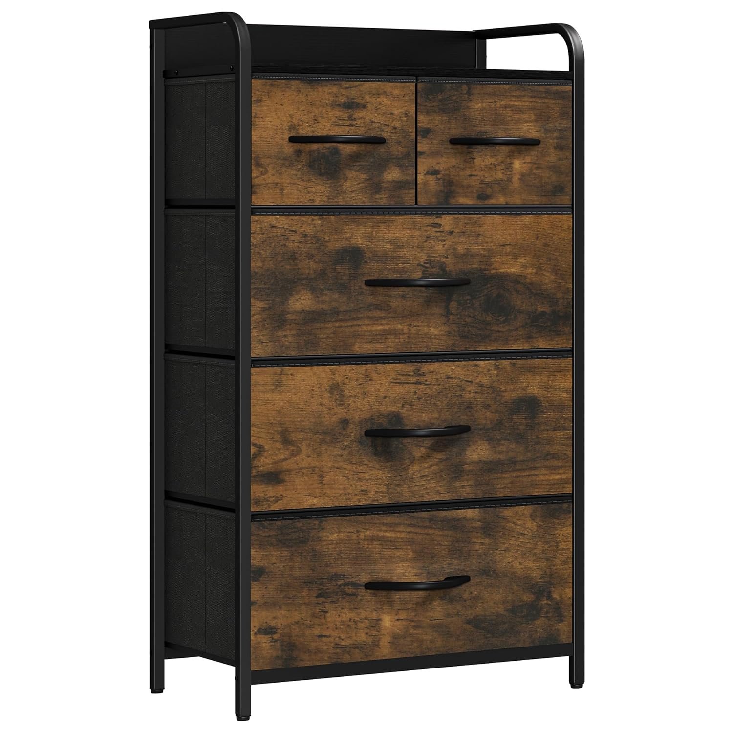 YITAHOME Chest of Drawer with 5 Drawers for Bedroom Fabric Dresser Storage Drawers With Handles Metal Frame for Living Room, Hallway,Rustic Brown